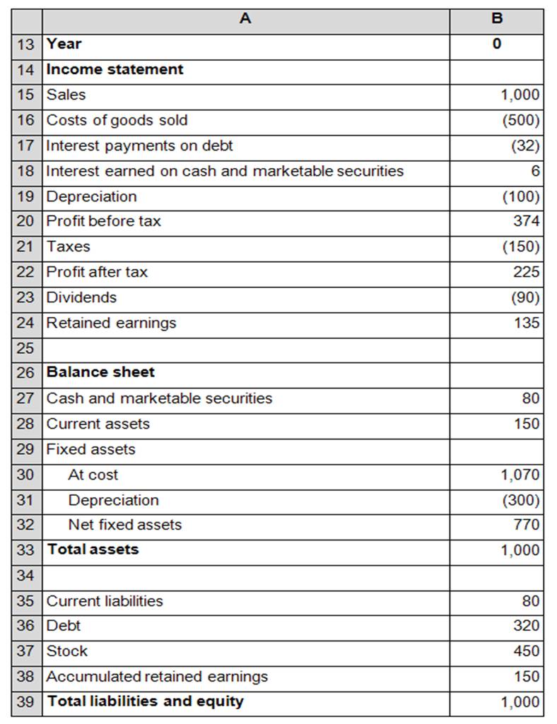 אנו רוצים ליצור תחזית של הדו"חות הפיננסיים של הפירמה. המכירות של השנה האחרונה שהסתיימה (שנה 0) הם 1,000. דו"ח רווח והפסד (Income Statement) ודו"ח המאזן (Balance Sheet) של השנה האחרונה (שנה 0) מצורפים בגיליון הבא: