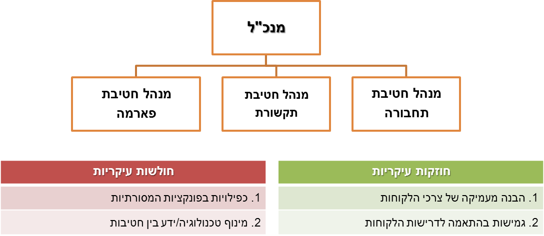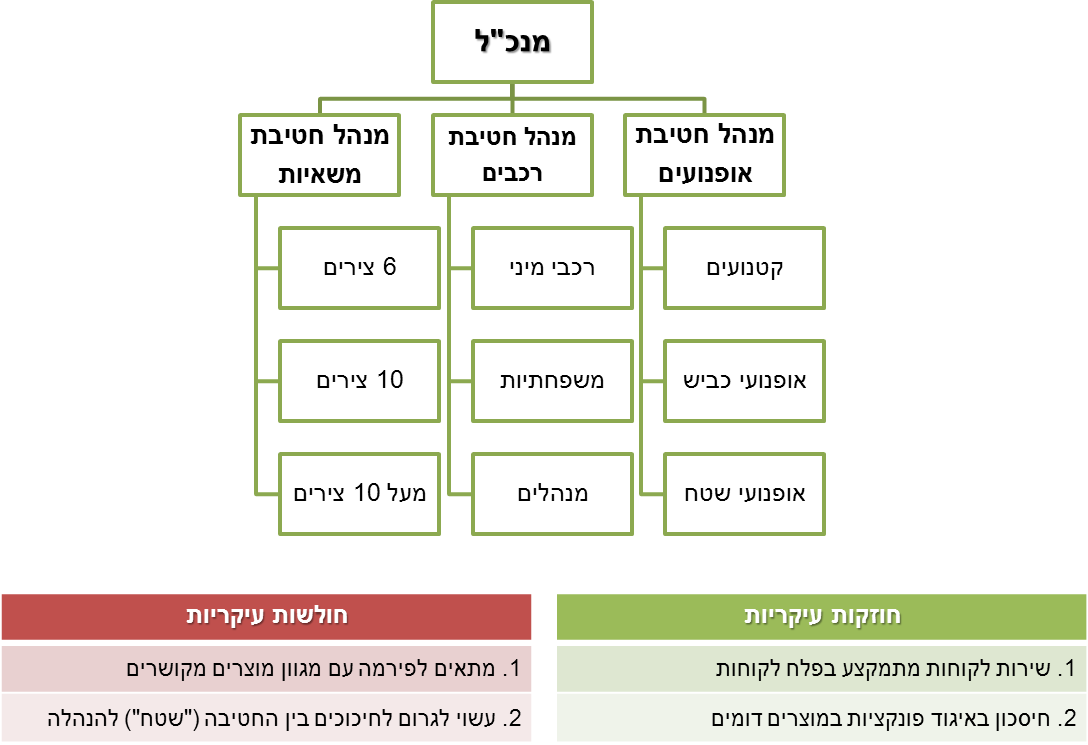 סוגים של מבנה ארגוני קיימים 6 סוגים של מבנים ארגוניים. לכל מבנה חוזקות וחולשות שונות, והוא מתאים לסוג מסוים של סביבה עסקית, גודל פירמה, ועוד. מבנה פונקציונלי הפירמה מאוגדת תחת תחומי עיסוק (פונקציות) מסורתיות - שיווק, הנדסה, מכירות, תפעול, כספים, ייצור, וכד'. המבנה פופולארי כיוון שהוא מבדל את התתמחות של כל פונקציה. ![]() דוגמא - מבנה ארגוני פונקציונלי מבנה מוצרי הפירמה מאוגדת תחת תחומי עיסוק (פונקציות) מסורתיות - שיווק, הנדסה, מכירות, תפעול, כספים, ייצור, וכד'. המבנה פופולארי כיוון שהוא מבדל את ההתמחות של כל פונקציה. ![]() דוגמא - מבנה מוצרי מבנה חטיבתי-מוצרי הפירמה מאוגדת תחת תחומי עיסוק (פונקציות) מסורתיות - שיווק, הנדסה, מכירות, תפעול, כספים, ייצור, וכד'. המבנה פופולארי כיוון שהוא מבדל את ההתמחות של כל פונקציה. ![]() דוגמא - מבנה חטיבתי-מוצרי מבנה מבוסס-לקוח הפירמה מאוגדת סביב קטגוריות של לקוחות עם צרכים מסוימים ומבודלים. מבנה כזה טוב כאשר קייים אגדים של לקוחות, והמוצרים שמספקים להם ניתנים לבידול. ![]() דוגמא - מבנה מבוסס-לקוח מבנה גאוגרפי/אזורי הפירמה מאוגדת סביב לאזורים גאוגרפים בה היא פועלת, וכל חטיבה גאוגרפית מכילה את כל הפונקציות הנדרשות לפעולה באזור. באופן כזה קל לזהות מרכזי רווח ולהאציל סמכויות לאזורים. ![]() דוגמא - מבנה גאוגרפי/אזורי מבנה מטריציוני במבנה ארגוני מטריציוני עובד עשוי לדווח ליותר ממנהל יחיד - ישנו המנהל הישיר (פונקציונלי) וישנו מנהל מטריציוני (מוצר/אזור וכד'). ![]() דוגמא - מבנה מטריציוני תכנון מבנה ארגוני בתכנון מבנה ארגוני צריך להתחשב בשני גורמים עיקריים: הסביבה החיצונית של הפירמה, והאסטרטגיה העסקית של הפירמה. הפירמה מתחילה לרוב סביב מוצר אחד, ומתפתחת למוצרים נוספים ואזורים נוספים. ככל שמגוון המוצרים גדול יותר וההתרחבות הגאוגרפית מתגברת, המבנה הארגוני של הפירמה יהפוך לגורם חשוב בהצלחה. תכנון המבנה הארגוני כולל שילוב נכון של סביבה חיצונית, אסטרטגיה, תרבות ארגונית, טכנולוגיה, אורך חיי המוצר. |